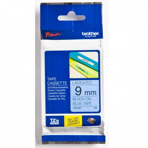 Brother originální páska do tiskárny štítků, Brother, TZE-521, černý tisk/modrý podklad, laminovaná, 8m, 9mm