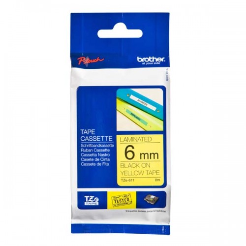 Brother originální páska do tiskárny štítků, Brother, TZE-611, černý tisk/žlutý podklad, laminovaná, 8m, 6mm