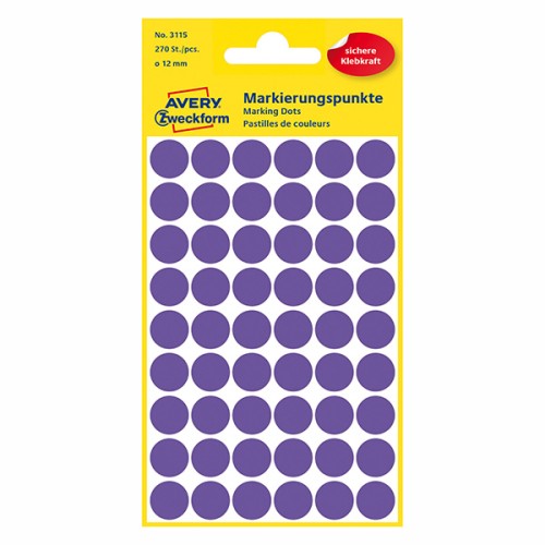 Fialové samolepicí značkovací kulaté etikety 3115 o průměru 12 mm Avery Zweckform jsou ideální pro značení, archivaci, organizaci a plánování. 270 kulatých etiket na arších v balení.