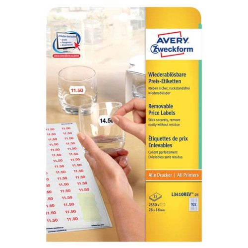 Avery Zweckform cenovky 26mm x 16mm, A4, bílé, 102 etiket, snímatelné, baleno po 25 ks, L3410REV-25, pro laserové a inkoustové tis