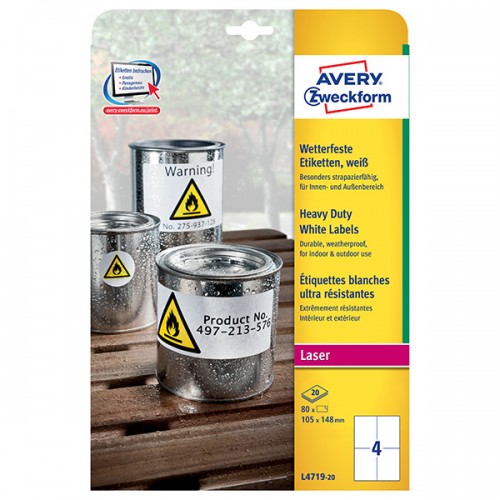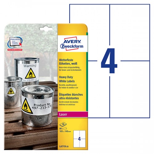 Avery Zweckform etikety 105mm x 148mm, A4, matné, bílé, 4 etikety, velmi odolné, baleno po 20 ks, L4719-20, pro laserové tiskárny