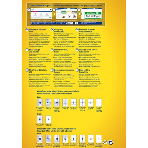 Skvělé řešení pro označování ve vlhkém a prašném prostředí - velmi odolné etikety od Avery Zweckform. Polyesterové etikety jsou mnohem odolnější než klasické papírové etikety. Skvěle se hodí pro trvalá a dlouhodobá značení v rušných prostorech průmyslových hal či skladů. Bez obav jimi můžete označit i venku stojící předměty. Mají vysokou lepivost, jsou odolné vůči mastnotě, znečištění, UV záření, vodě, natržení a výkyvům teplot od -20°C do +80°C. Díky těmto vlastnostem si můžete být jisti, že Vaše označení vydrží na svém místě i za ztížených podmínek. Naše etikety Vás přesvědčí také prvotřídními tiskovými výsledky a prokázanou Top kvalitou. Ostrý tisk, který se nerozmazává, a vysoká lepivost na nejrůznějších typech povrchů. Tyto vlastnosti našich etiket pravidelně testujeme ve vlastních laboratořích. Samozřejmě se můžete spolehnout na garanci plynulého tisku etiket a na to, že průchod archů etiket tiskárnou neznečistí tiskárnu lepidlem. Velmi odolné etikety mohou být potisknuty na všech běžných typech laserových tiskáren. Další servis, který Vám bezplatně nabízíme - aplikace pro tvorbu profesionálně vypadajících etiket Avery® Design & Print. Zde naleznete jak prázdné šablony, do kterých vložíte vlastní text či obrázek, tak i široký výběr již navržených, moderních designů etiket, které pravidelně aktualizujeme a vylepšujeme. Pár jednoduchých kroků pro dokonale vypadající etikety: jednoduše zadejte kód etikety, zpracujte, vytiskněte a máte hotovo!