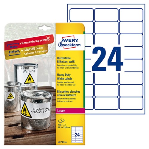 Avery Zweckform etikety 63.5mm x 33.9mm, A4, bílé, 24 etiket, velmi odolné, baleno po 8 ks, L4773-8, pro laserové tiskárny a kopír