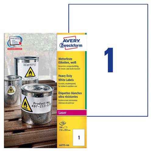 Avery Zweckform etikety 210mm x 297mm, A4, matné, bílé, 1 etiketa, velmi odolné, baleno po 100 ks, L4775-100, pro laserové tiskárn