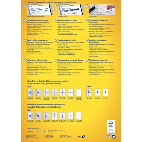 Skvělé řešení pro označování ve vlhkém a prašném prostředí - velmi odolné etikety od Avery Zweckform. Polyesterové etikety jsou mnohem odolnější než klasické papírové etikety. Skvěle se hodí pro trvalá a dlouhodobá značení v rušných prostrech průmyslových hal či skladů. Bez obav jimi můžete označit i venku stojící předměty. Mají vysokou lepivost, jsou odolné vůči mastnotě, znečištění, UV záření, vodě, natržení a výkyvům teplot od -20°C do +80°. Díky těmto vlastnostem si můžete být jisti, že Vaše označení vydrží na svém místě i za ztížených podmínek. Naše etikety Vás přesvědčí také prvotřídními tiskovými výsledky a prokázanou Top kvalitou. Ostrý tisk, který se nerozmazává a vysoká lepivost na nejrůznějších typech povrchů. Tyto vlastnosti našich etiket pravidelně testujeme ve vlastních laboratořích. Samozřejmě se můžete spolehnout na garanci plynulého tisku etiket a na to, že průchod archů etiket tiskárnou neznečistí tiskárnu lepidlem. Velmi odolné etikety mohou být potisknuty na všech běžných typech laserových tiskáren. Pár jednoduchých kroků pro dokonale vypadající etikety: Další servis, který Vám bezplatně nabízíme - aplikace pro tvorbu profesionálně vypadajících etiket Online Designer Avery® Design & Print. Zde naleznete jak prázdné šablony, do kterých vložíte vlastní text či obrázek, tak i široký výběr již navržených, moderních designů etiket, které pravidelně aktualizujeme a vylepšujeme. Jednoduše zadejte kód etikety, zpracujte, vytiskněte a máte hotovo!