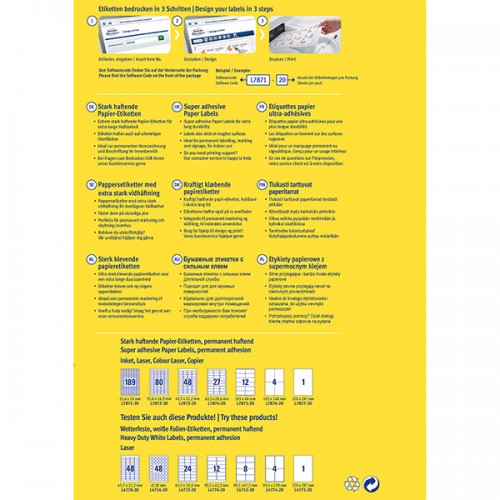 Bílé etikety s vysokou lepivostí od Avery Zweckform drží dvakrát silněji než běžné papírové etikety. Vzhledem k mimořádně silné přilnavosti jsou etikety vhodné pro značení produktů a zásob nebo k vytvoření bezpečnostních oznámení ve vnitřních prostorách. Papírové etikety drží na teplém i studeném podkladu nebo např. na nerovných, hrubých či prašných površích. Samozřejmě se můžete spolehnout na garanci plynulého tisku etiket a na to, že průchod archů etiket tiskárnou neznečistí tiskárnu lepidlem. Etikety s vysokou lepivostí mohou být potisknuty na všech běžných typech tiskáren. Pár jednoduchých kroků pro dokonale vypadající etikety: Další servis, který Vám bezplatně nabízíme - aplikace pro tvorbu profesionálně vypadajících etiket Online Designer Avery® Design & Print. Zde naleznete jak prázdné šablony, do kterých vložíte vlastní text či obrázek, tak i široký výběr již navržených, moderních designů etiket, které pravidelně aktualizujeme a vylepšujeme. Jednoduše zadejte kód etikety, zpracujte, vytiskněte a máte hotovo!