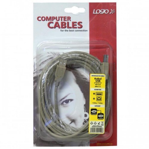 Kabel USB (2.0) - USB A M - USB B M - 5m, šedýPropojovací USB 2.0 kabel určený k propojení běžných zařízení jako například počítače s tiskárnou (či skenerem nebo multifunkčním zařízením). Baleno v LOGO blistru.