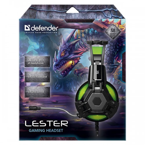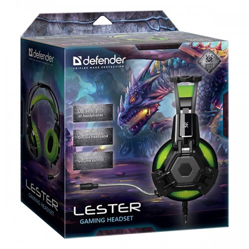 Defender Lester, herní sluchátka s mikrofonem, ovládání hlasitosti, černo-zelená, 2.0, 50 mm měniče typ 2x 3.5 mm jack + USB