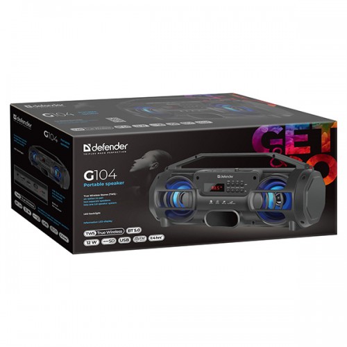 Defender reproduktor G104, Li-Ion, 2.0, 12W, černý, regulace hlasitosti, LED podsvícení, BT 5.0, TWS, FM, MicroSD, 70Hz~18kHz