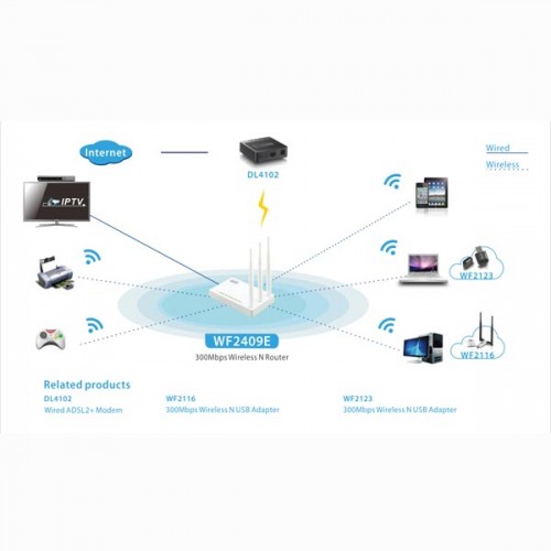 Wireless-N router WF2409E je router kompatibilní se zařízeními 802.11b/g/n a poskytuje přenosové rychlosti až 300Mbps, nabízí lepší výkon pro surfování na webu, email a sdílení souborů. Kromě toho podporuje multi-režimy, včetně bezdrátových AP, WDS, AP + WDS, Repeater, Client. Snadné nastavení a instalace díky WPS tlačítku.