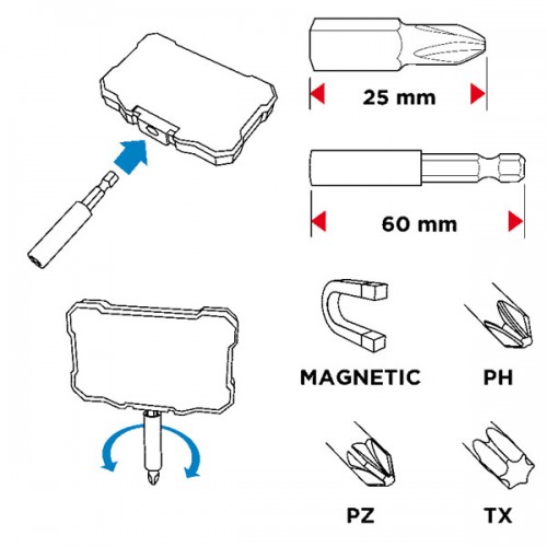 Sada bitů Graphite s magnetickým držákem a boxem, který lze také využít jako držák šroubováku.