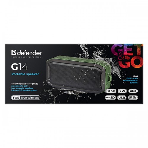Defender reproduktor G14, Li-Ion, 1.0, 7W, černý, regulace hlasitosti, BT 5.0, TWS, IP66, zabudovaný pasivní zářič, 50Hz~20kHz