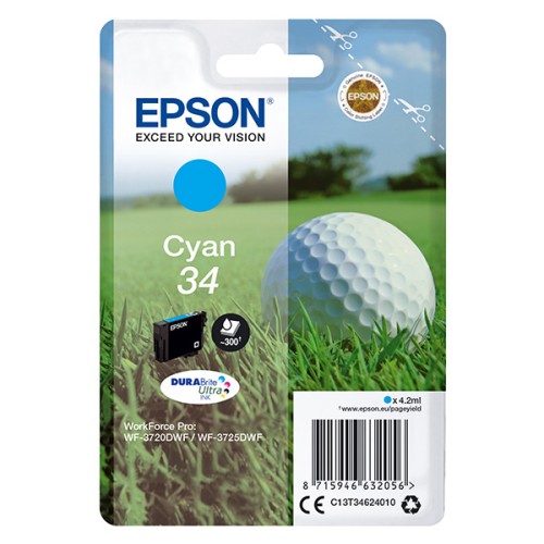 Epson originální ink C13T34624020, T346240, cyan, s ochranou, 4.2ml, Epson WF-3720DWF, 3725DWF
