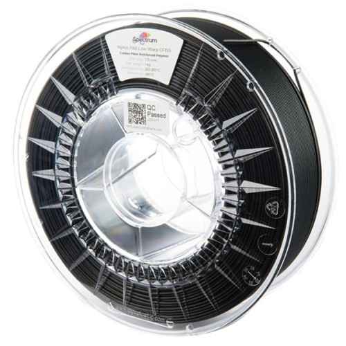 Spectrum PA6 Low Warp CF15S je skutečný specialista na velké zatížení. Model „LowWarp“ se vyznačuje extra obsahem směsi navrženým pro zlepšení toku během vytlačování materiálu – a tím lepší přilnavosti částic materiálu. Při použití 15% uhlíkových vláken se tuhost zdvojnásobí a zlepší se pevnost v tahu (až 120 MPa). Spectrum PA6 Low Warp CF15S má navíc oproti neplněné verzi vyšší tepelnou odolnost HDT 180°C. Obsah vláken snižuje smrštění, což je běžné nebo většina vysokoteplotních materiálů, čímž je proces tisku mnohem jednodušší a výtiskům dodává esteticky příjemný „karbonový“ vzhled.
