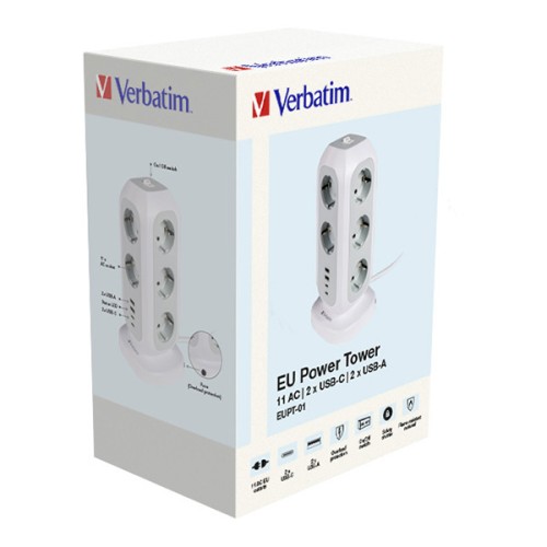 S nabíjecí stanicí pro EU od společnosti Verbatim přetvoříte jednu evropskou zásuvku na 11 zásuvek, dva porty USB-C a dva porty USB-A. Tato stanice pro více zástrček disponuje 2m prodlužovacím kabelem a nabízí všechny zásuvky, které potřebujete k nabití všech svých zařízení na 100 %.