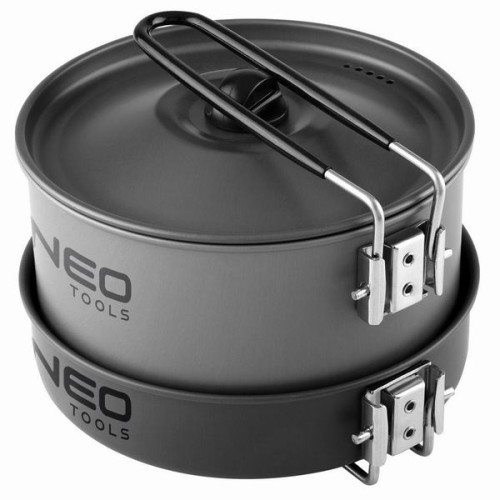 Praktická sada turistického nádobí 3v1 značky NEO, která se skládá z hrnce, pánve a rychlovarné konvice. Jedná se o lehkou sadu pro vaření vody a přípravu pokrmů v polních podmínkách. Je vyrobena z odolného a lehkého eloxovaného hliníku. Hmotnost celé sady je pouhých 616 g. Nádobí má sklopné, izolované rukojeti a vyznačuje se také platným certifikátem schválení LFGB pro styk s potravinami. Sada obsahuje hrnec o objemu 1,7 l, průměru 173 mm a výšce 122 mm; Pánev 0,7l o průměru 178mm a výšce 48mm; a konvici 0,8l o průměru 152mm a výšce 96mm. Jde o ucelenou kolekci turistického nádobí, jehož kvalitu potvrzuje značka NEO.