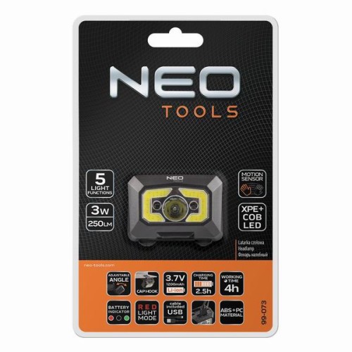 Čelovka značky NEO, fungující na bázi lithium-iontové baterie 3,7 V 1200 mAh. Zařízení je vybaveno světlem až 250 lm - včetně dvou COB LED, které poskytují rozptýlený paprsek, a XPE - nabízí nastavitelný paprsek světla pomocí pohyblivé hlavy. Doba nabití svítilny na plnou úroveň je pouze 2,5 hodiny. Na plnou baterii vydrží pracovat asi 4 hodiny. Vestavěný indikátor umožňuje ovládat úroveň nabití. Svítilna má funkci zapnutí pohybového senzoru (který mávnutím ruky aktivuje světlo), funkci červeného světla a změnu paprsku na zaostřený, rozptýlený, zaostřený a rozptýlený, červený nebo červený stroboskop.