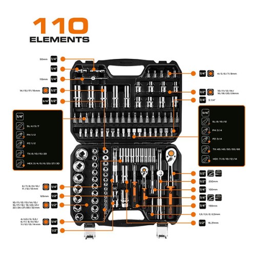 NEO 1/2" a 1/4" (č. v. 10-066) obsahuje 110 kusů z vysoce kvalitní chrom-vanadiové oceli. Sada obsahuje ráčny 1/2" a 1/4". Sada obsahuje širokou škálu nástrčných hlavic (velikosti 4 až 32 mm) a bitů (ploché, křížové, šestihranné, Torx). Sada je navíc vybavena širokou škálou příslušenství. Vše je dodáváno v praktickém kufříku. Spolehlivost výrobku je potvrzena zárukou 25 let. Značka NEO splňuje očekávání profesionálů.