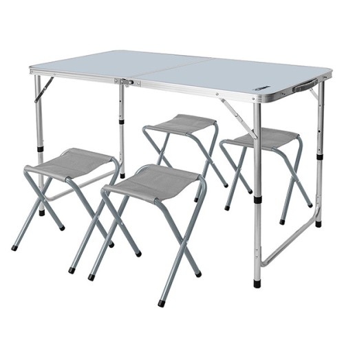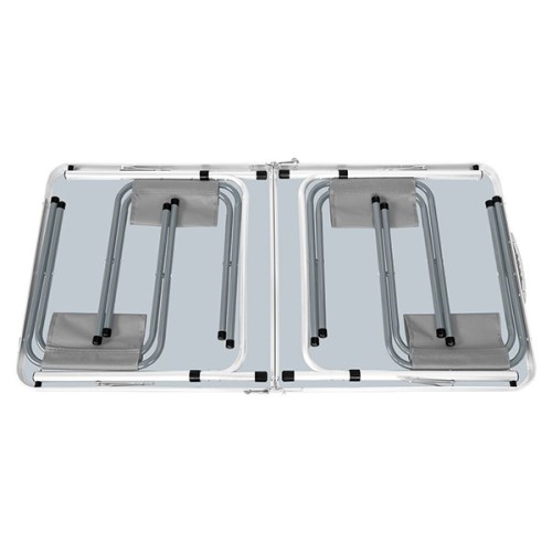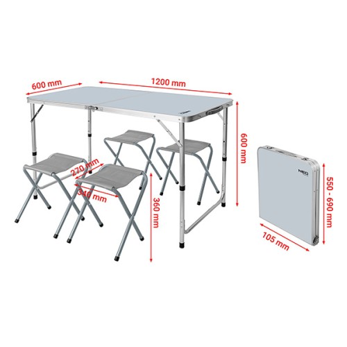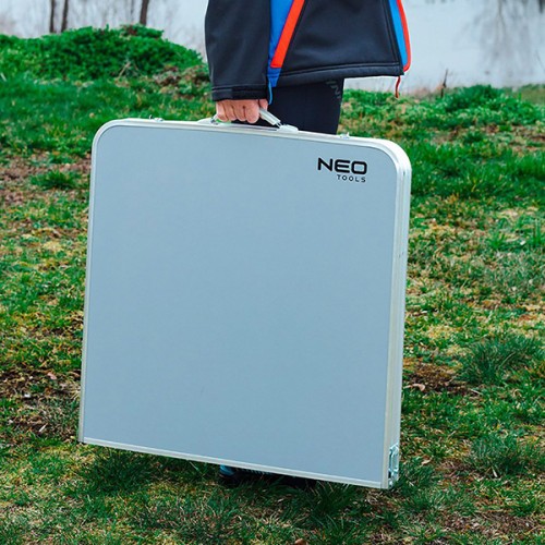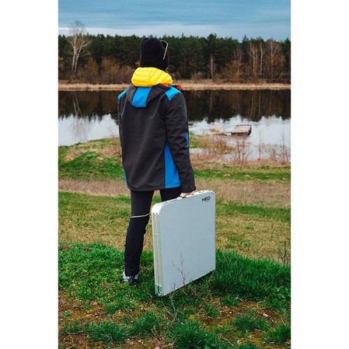 Kempingová sada 63-159 od společnosti NEO je skládací stůl spolu se čtyřmi židlemi. Díky své konstrukci se sada složí do kompaktního kufříku s transportním madlem pro snadné přenášení. Nastavitelná výška stolu umožňuje jeho vhodné přizpůsobení vzhledem k místu k sezení. Deska stolu je vyrobena z MDF a rám z lehkého hliníku. Konstrukce židlí je naopak ocelová a sedák je z odolného polyesteru. Rozměry stolu: délka - 120 cm, šířka - 60 cm, výška - od 54 do 70 cm. Stoličky mají tyto parametry: délka - 33 cm, šířka - 27 cm a výška - 35 cm. Rozměry po složení do kufříku jsou: 60 x 60 x 10,5 cm. Hmotnost sady je 6,9 kg a maximální zatížení stoličky je 110 kg. Kempingovou soupravu od značky NEO doporučujeme pro širokou škálu použití.
