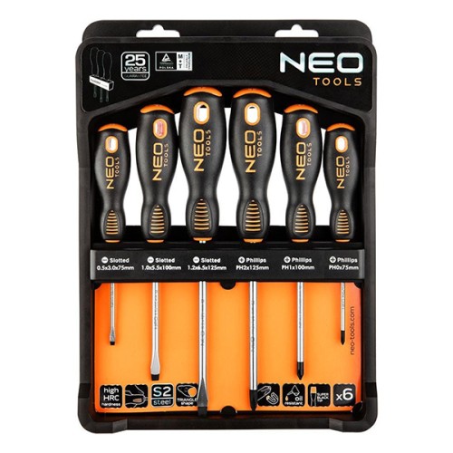 Sada šroubováků NEO (č. 04-213) obsahuje 6 šroubováků: plochých a křížových. Čepel šroubováku je vyrobena z extrémně odolné oceli S2. Pracovní konec čepele byl tepelně zpracován, čímž bylo dosaženo odpovídající tvrdosti a odolnosti proti ohybu. Šroubovák má magnetický hrot. Trojúhelníkový tvar rukojeti s profilovanou opěrkou palce snižuje zatížení ruky při práci a usnadňuje dosažení optimálního krouticího momentu. Rukojeť ze dvou materiálů zabraňuje klouzání v ruce a je odolná vůči chemikáliím, olejům a tukům. Kvalita nářadí je potvrzena 25letou zárukou výrobce. Sada je dodávána na užitečném věšáku pro udržení většího pořádku. Značka NEO splňuje očekávání profesionálů.