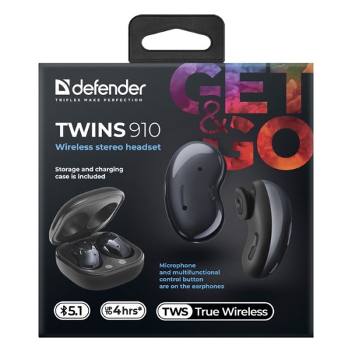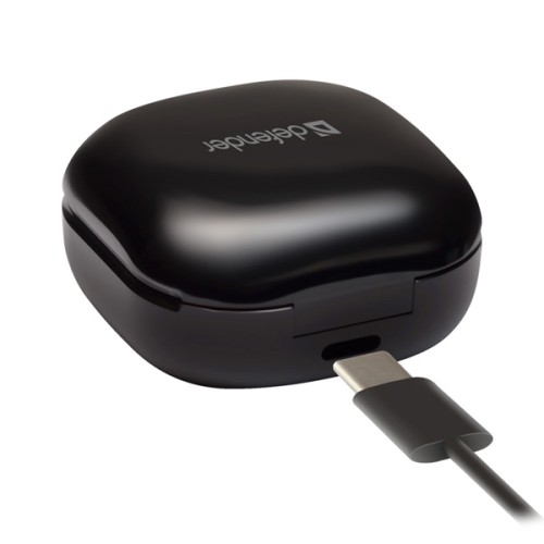 Defender Twins 910, sluchátka s mikrofonem, ovládání hlasitosti, černá, špuntová, BT 5.1, TWS, nabíjecí pouzdro typ bluetooth