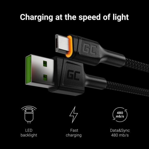 Kabel Green Cell GC Ray USB - kabel Micro USB 200 cm s oranžovým LED podsvícením, rychlé nabíjení Ultra Charge, QC 3.0