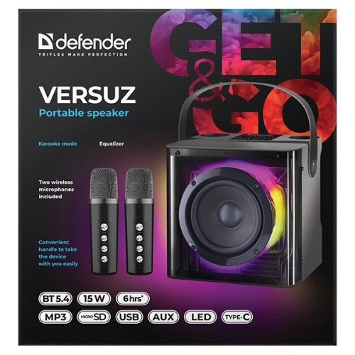 Součástí balení reproduktoru Defender VERSUZ jsou hned dva bezdrátovémikrofony, díky nimž si můžete užít zábavu naplno. Funkce karaoke umožní zpívatoblíbené skladby sólo nebo ve dvojici a promění každou oslavu či setkání spřáteli v nezapomenutelný zážitek. Mikrofony jsou lehké, pohodlně se drží asnadno se propojí s reproduktorem bez zbytečných kabelů. Karaoke režim navícnabízí jasný a kvalitní přenos hlasu, takže si připadáte jako na skutečnémpódiu. Tento prvek dělá z Defender VERSUZ nejen reproduktor, ale i zdroj zábavypro celou rodinu a přátele.