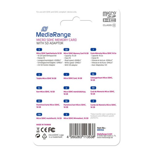 MediaRange Micro Secure Digital Card, 16GB, micro SDHC, MR958, UHS-I U1 (Class 10), s adaptérem