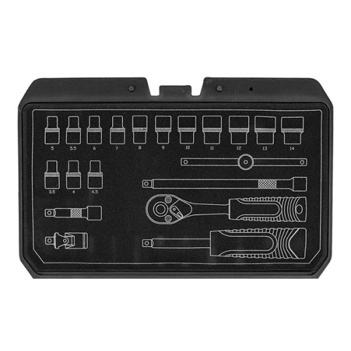 Sada nástrčných klíčů NEO TOOLS 1/4" (20 kusů) je funkčním a kompaktním řešením pro každodenní mechanické, servisní a domácí práce. Sada obsahuje ráčnu 72T 1/4", 14 krátkých šestihranných nástrčných klíčů (3,5-14 mm), dva prodlužovací nástavce, univerzální kloub, T-rám a nástrčný klíč.